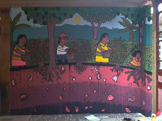 En SantaMaria de Dota hay un bar llamado LA CUEVA, es de una señora super empoderada conocida como TITA, conviví con ella y su familia unos días mientras me llevaba a conocer el lugar para que le pintara este mural, en temporada de cogida de café llega a Dota una migración de indigenas Gnobe desde Panamá, ellos son los que recogen las semillas del café desde hace años.